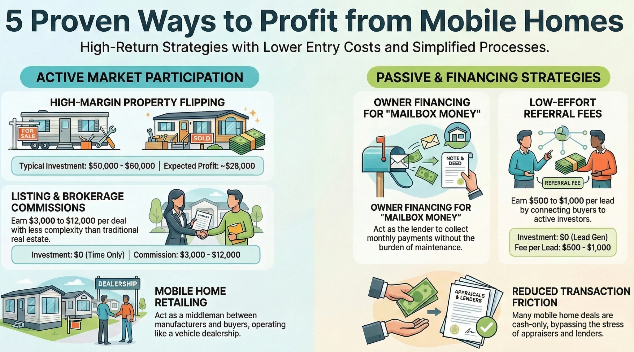 For those who want to stay on the sidelines, the referral model offers a massive return on time. This is effectively "wholesaling" for the mobile home niche.